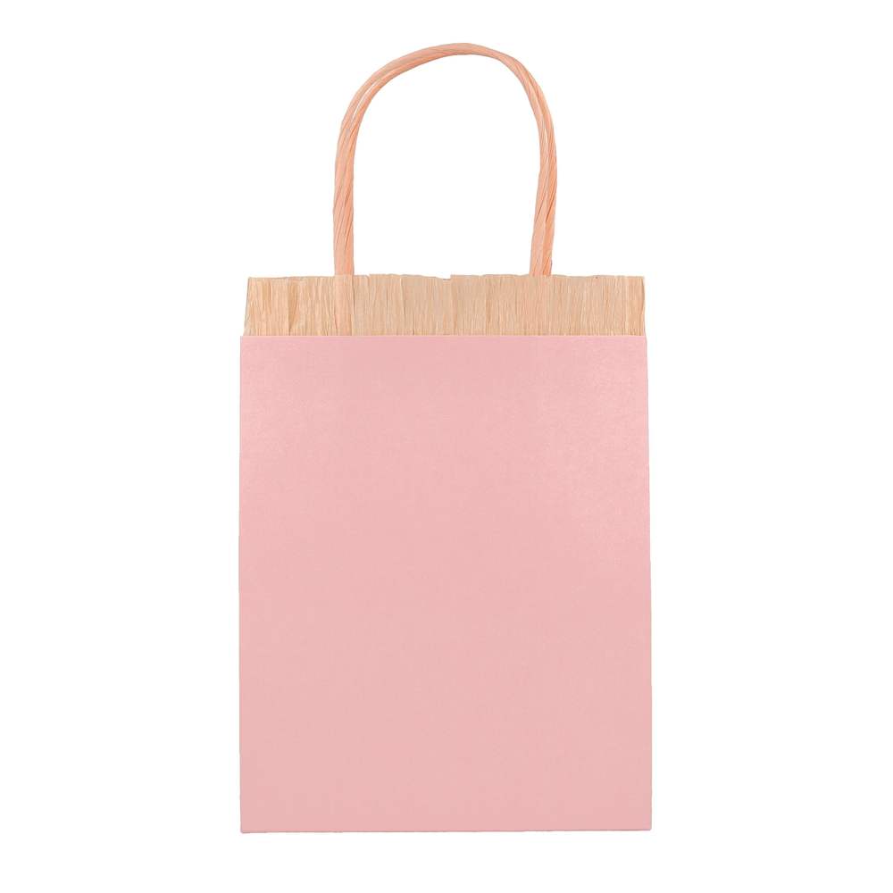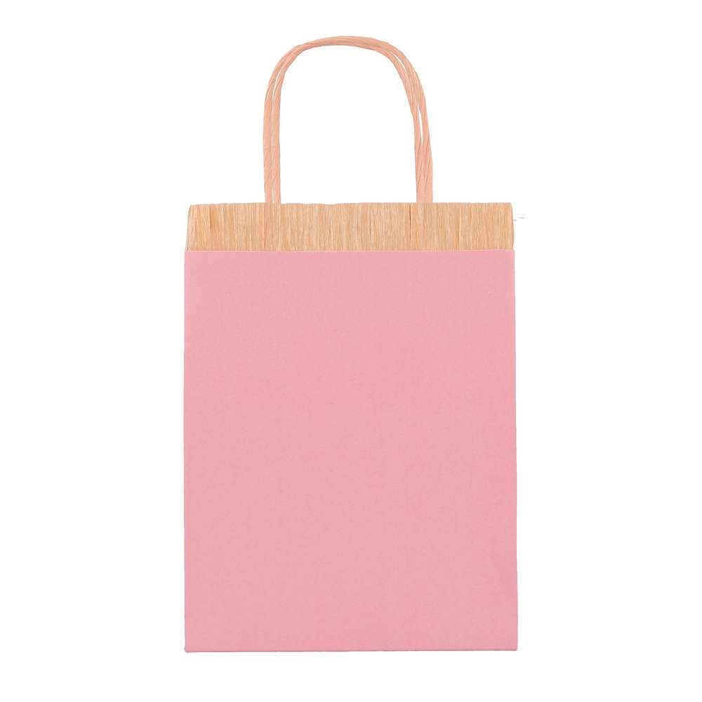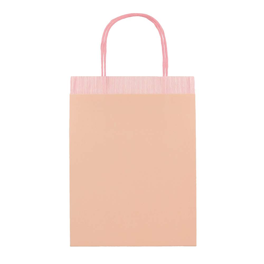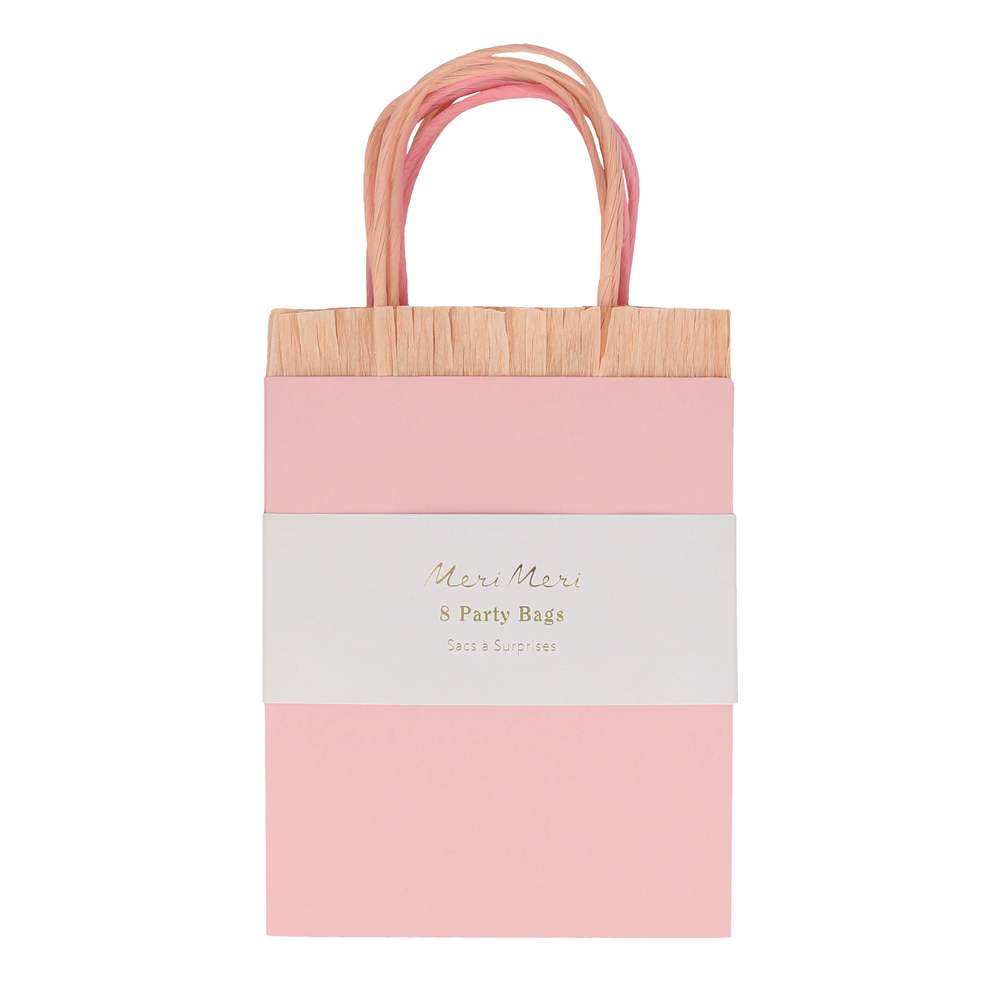 8 Partytüten in 3 verschiedenen Farbtönen mit Krepprand und rosafarbenen Kordelgriffen.