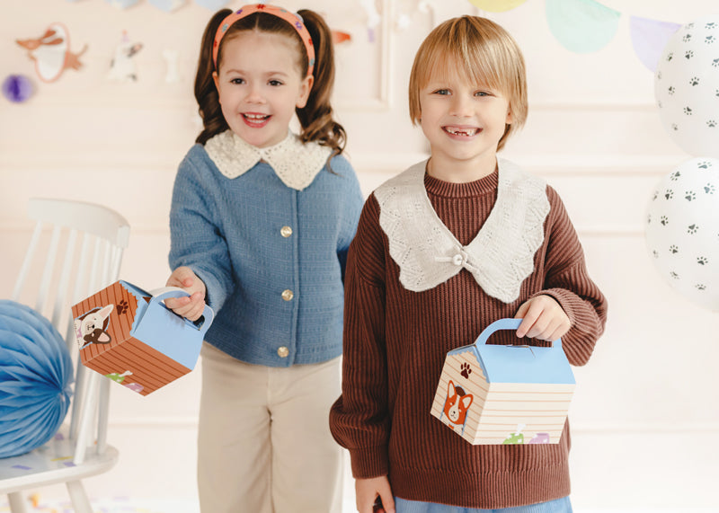 Süße Kuchenboxen im 2 verschiedenen Hundehüttendesigns. Diese Boxen sind perfekt, um Gebäck, Cupcakes oder Geschenke charmant zu verpacken. Die schöne Hundehüttenoptik macht sie zum Highlight auf jeder Tierparty..
