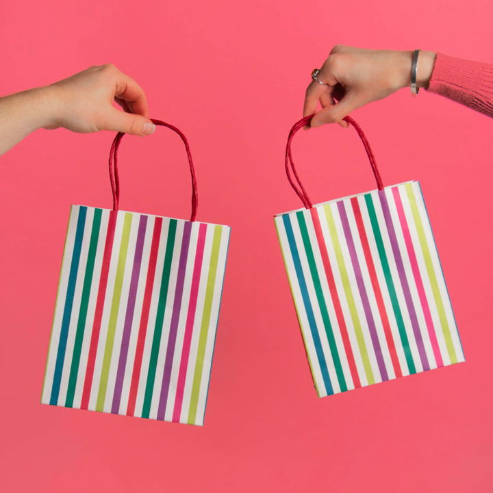 8 farbenfrohe Tüten passend zu fast allen Partys. Mit diesen Papiertüten könnt ihr die Geburtstags- oder Gastgeschenke stilvoll überreichen.